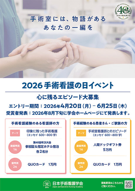 2026も「手術看護の日」イベントとして、手術看護にまつわるエッセイを募集いたしますので、一般の方、手術室看護師の方の手術看護への熱い思いをお寄せください。
